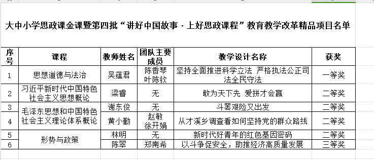 喜讯:近日,我院获得大中小学思政课金课暨第四批“讲好中国故事·上好思政课程”教育教学改革精品项目一等奖一项,二等奖四项,三等奖一项。