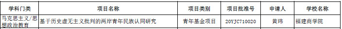 2020年3月20日,教育部社会科学司公布的《教育部社科司关于2020年度教育部人文社会科学研究一般项目立项的通知》文件中,我院黄玮博士申报的项目《基于历史虚无主义批判的两岸青年民族认同研究》,历经多次的修改,不断打磨,功夫不负有心人,最终获得教育部社科青年基金立项。