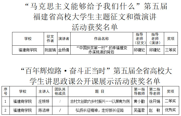 近日,《中共福建省委教育工委关于公布习近平新时代中国特色社会主义思想大学习领航计划系列主题活动获奖名单的通知》(闽委教思〔2022〕3号),我院选送优秀作品参评省级公开课、微电影展示以及主题征文和微演讲活动,荣获二等奖1项,三等奖1项,优秀奖1项。