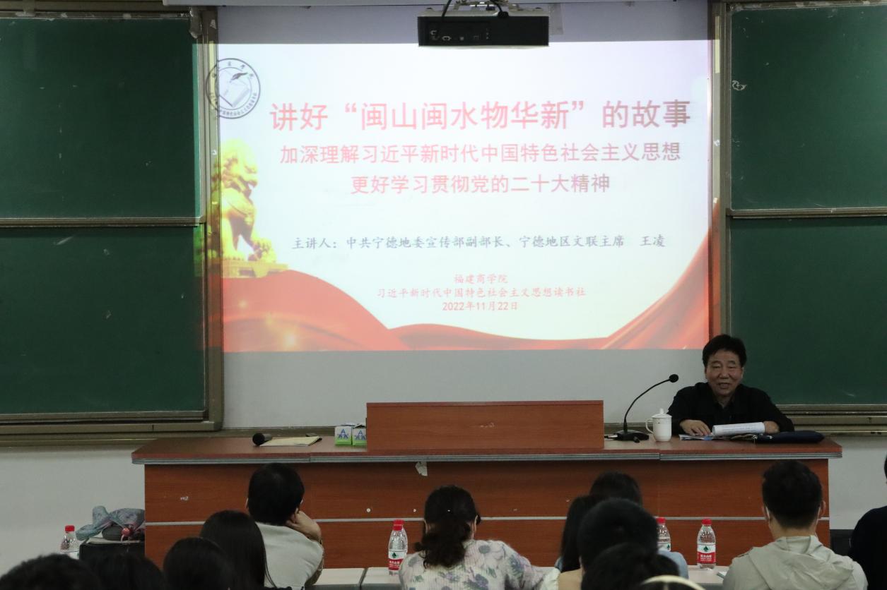 闽山闽水物华新,“习言习语”催人进。11月22日晚,中共宁德地委宣传部原副部长、原宁德地区文联主席王凌研究员受邀莅临我校,为我校师生作了题为《讲好“闽山闽水物华新”的故事,加深理解习近平新时代中国特色社会主义思想,更好学习贯彻党的二十大精神》的专题讲座。校党委副书记吴访益,永利3044集团、机关党委负责同志,学校习近平新时代中国特色社会主义思想学生读书社、教职工读书社社员代表参加。