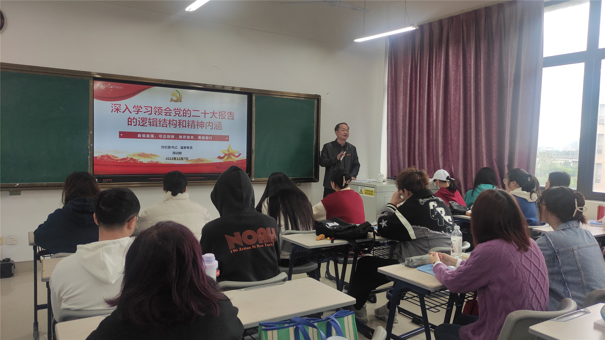 12月7日,校纪委书记、监察专员周训胜在连江校区诚信楼409为2021级烹饪与营养教育班学生讲授思政课,宣讲党的二十大精神。