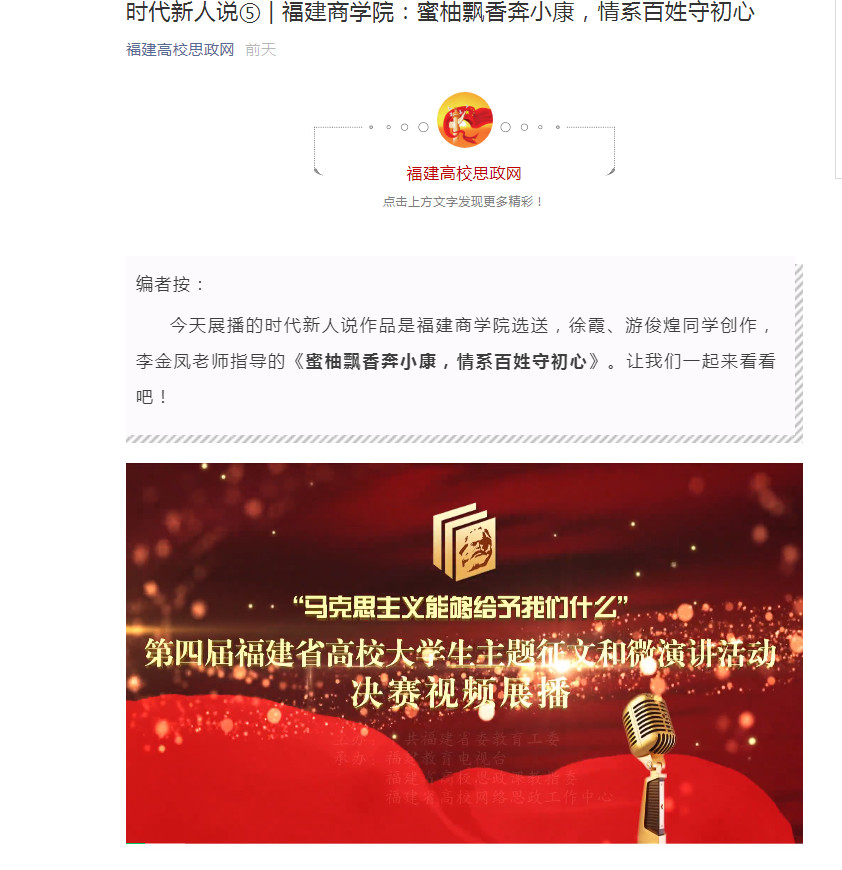 2021年4月7日,福建高校思政网展出《蜜柚飘香奔小康,情系百姓守初心》微演讲视频。该微视频由永利3044集团李金凤老师指导,徐霞、游俊煌两位学生创作。