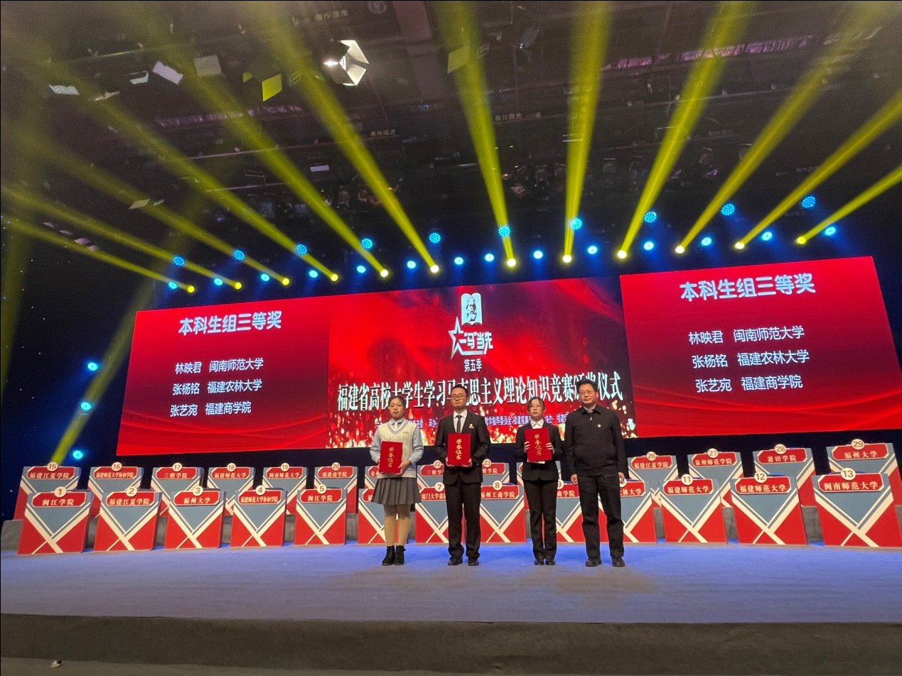 12月20日,由省委教育工委主办的第五季福建省高校大学生学习马克思主义理论“一‘马’当先”知识竞赛落下帷幕, 我校国际经贸学院张艺宛和刘键滨、传媒与会展学院陈姝婷3位同学进入总决赛参与现场答题,张艺宛荣获本科组三等奖。