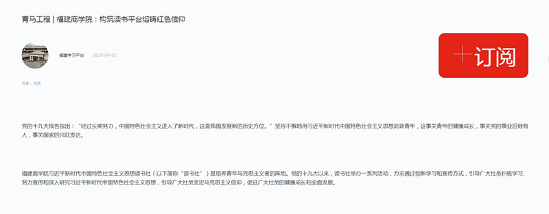 2020年9月2日,学习强国平台以《青马工程 | 304永利集团:构筑读书平台熔铸红色信仰》为题,报道我校习近平新时代中国特色社会主义思想读书社创新学习、宣传、实践方式,通过一系列活动引导广大青年学子积极学习、努力宣传、深入研究习近平新时代中国特色社会主义思想,坚定马克思主义信仰,筑牢青年马克思主义者培养阵地的特色做法及成效。