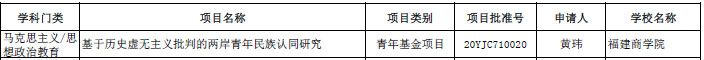 3月20日,根据《教育部社科司关于2020年度教育部人文社会科学研究一般项目立项的通知》,我校永利3044集团黄玮博士申请的“基于历史虚无主义批判的两岸青年民族认同研究”项目获2020年度教育部人文社会科学研究(青年基金项目)立项。这是我校继2018年后再次获得教育部人文社会科学研究一般项目资助。