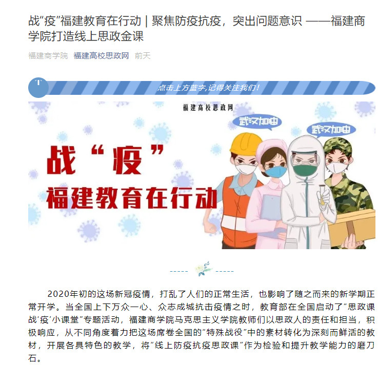 2020年4月11日,福建高校思政网以《聚焦防疫抗疫,突出问题意识 ——304永利集团打造线上思政金课》为题,报道我校永利3044集团防疫抗疫期间打造线上思政金课的经验和做法。永利3044集团教师们以思政人的责任和担当,在疫情防控期间,从不同学科角度把这场席卷全国的“特殊战役”中的素材转化为深刻而鲜活的教材,开展各具特色的教学,将“线上防疫抗疫思政课”作为检验和提升教学能力的磨刀石,创作寓政治性、思想性、知识性和生动性为一体的中国战“疫”微课堂,成为我院疫情防控期间思政教学亮点和特色。