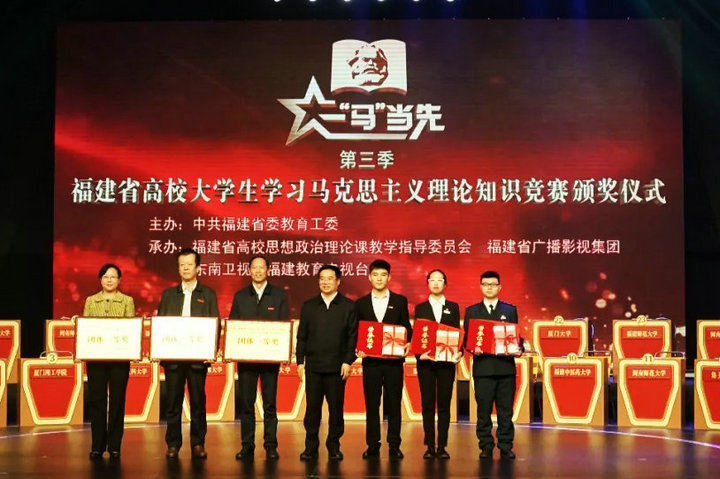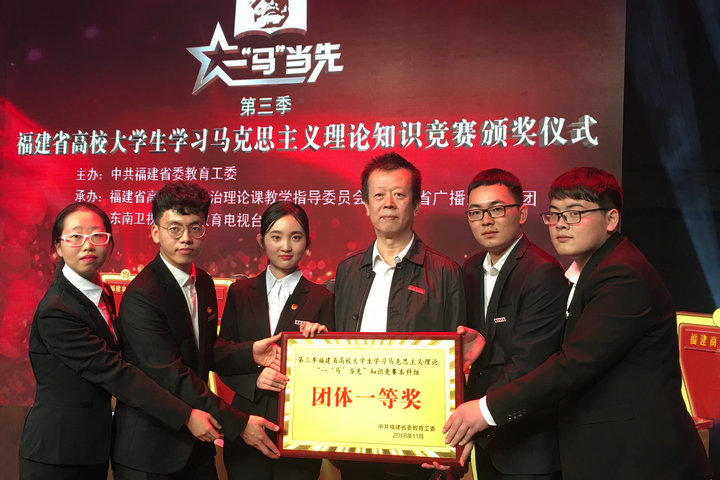 11月26日,由省委教育工委主办的第三季福建省高校大学生学习马克思主义理论“一‘马’当先”知识竞赛总决赛在福建省广播影视集团落下帷幕。经过激烈角逐,我校由会计系宋珊、外语系黄琳、国际经济与贸易系任凯杰和王阳、金融系肖军等5位同学组成的代表队,荣获本科组团体一等奖,宋珊荣获本科组个人一等奖,任凯杰和黄琳荣获本科组个人三等奖。