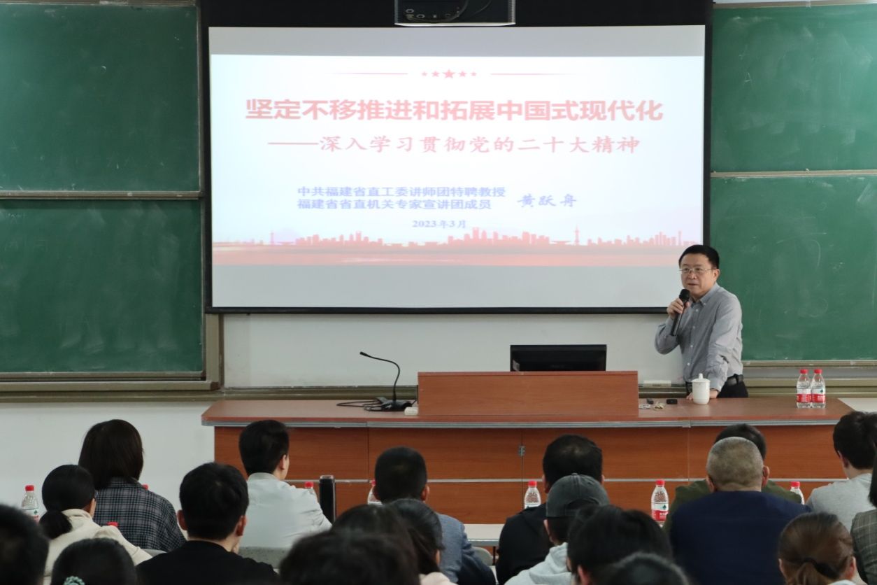 3月21日下午,中共福建省直工委讲师团特聘教授、省直机关专家宣讲团成员黄跃舟应邀到我校开展“坚定不移推进和拓展中国式现代化——深入学习贯彻党的二十大精神”专题讲座。永利3044集团部分教师、连江校区“青马”班部分学员、校习近平新时代中国特色社会主义思想读书社部分社员参加学习。