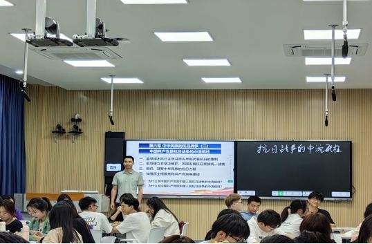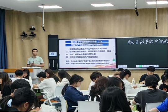 叶陈钦老师通过丰富、详实的史料以及情景式教学、互动式教学等方法,从“最早提出抗日主张并率先举起武装抗日的旗帜”,“倡导建立并坚决维护、巩固发展抗日民族统一战线”,“组织、凝聚中华民族的抗日力量”以及“加强抗日民主根据地和共产党自身建设”等维度讲述、分析了中国共产党是抗日战争的中流砥柱的具体表现,阐释了中国共产党在抗日战争中的历史地位、作用。授课中,叶陈钦老师循循善诱、深入浅出,运用“扮演体会情境”等模式以及延安“豆选”等一系列小故事展现中国共产党推动建立抗日民族统一战线、领导人民英勇抗战的大历史,促进学生深入理解中国共产党在抗日战争中的中流砥柱地位。