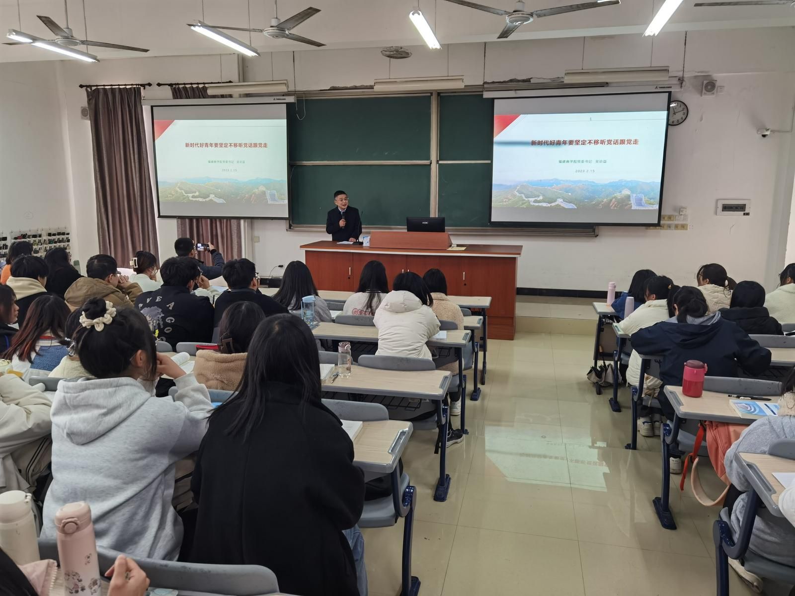 书记校长进课堂开讲 “开学第一课”。新学期,学校党委书记、校长带头为师生上“开学第一课”,宣讲党的二十大精神,深情寄语,引导学生扣好“人生第一粒扣子”。结合学习贯彻党的二十大精神以及落实全省“深学争优、敢为争先、实干争效”行动,用翔实的数据、具体的案例分析党的二十大报告概括的新时代十年党和国家事业取得的历史性成就、发生的历史性变革,勉励广大师生要坚定不移听党话、跟党走,怀抱梦想又脚踏实地,敢想敢为又善作善成,鼓励同学们在面对各种社会思潮的影响时要更加自信自强、富于思辨精神,立志做一个有理想、敢担当、能吃苦、肯奋斗的新时代好青年。