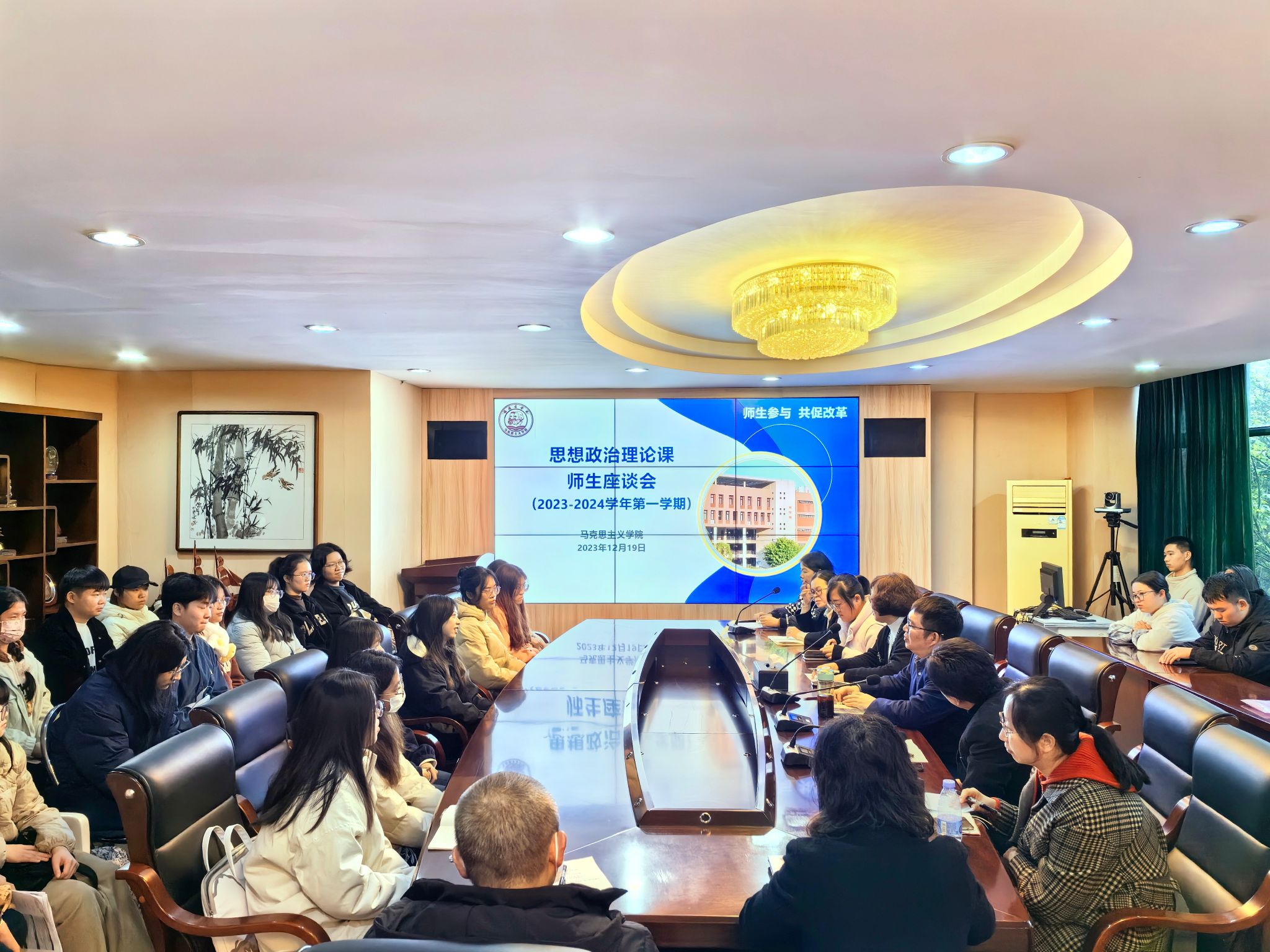 为更好促进思政课的教学和改革,提升学生在思政课中的获得感和对思政课的认同,12月19日下午,我校在马尾校区召开2023-2024第一学期思想政治理论课师生座谈会。校教务处、质量监控与评估处有关人员,永利3044集团教师代表,马尾校区学生代表共40人参加了会议。