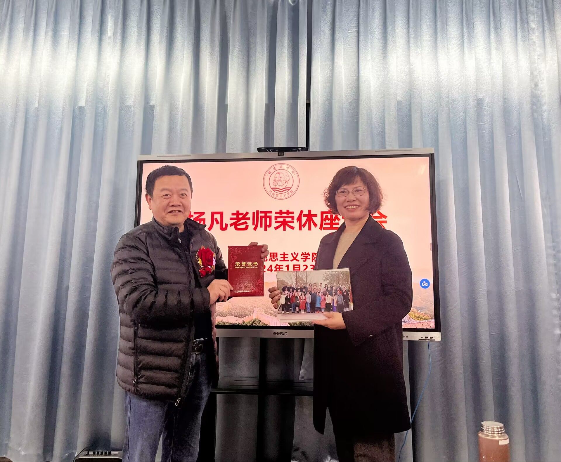 随后,我院为杨凡老师光荣退休举行隆重的欢送会。杨凡老师系我院思想道德与法治教研室教师,从教38年,退休在即。欢送会上,林萍院长为杨凡老师颁发了“光荣退休”纪念证书,并对杨凡老师为马院作出的贡献表示最诚挚的谢意。思想道德与法治教研室为杨凡老师献上鲜花及礼物,并表达了对杨凡老师的留念之情。接着,杨凡老师发表了深情的感言,感谢学校领导、单位同事的关心和厚爱,感恩在学院的每一天。最后,马院老师们纷纷表示:希望杨凡老师多与学院同仁联系,常回家看看,与学院共谋发展、与同仁共叙旧情。