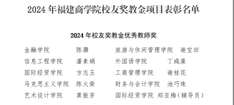9月19日下午,我校在连江校区学生活动中心召开庆祝第40个教师节暨表彰大会。我院陈火荣老师获得2024年校友奖教金优秀教师荣誉表彰,陈翠老师作为2024年福建省第七届高校青年教师教学竞赛一等奖获得者获得表彰。
