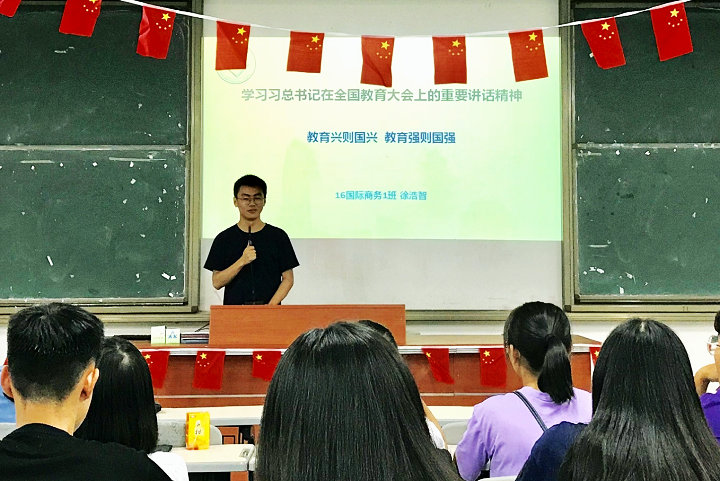 9月26日晚,我校习近平新时代中国特色社会主义思想读书社在连江校区诚信楼大阶一教室开展第二场学生小分队“大宣讲”活动。本次宣讲以“《习近平新时代中国特色社会主义思想三十讲》导读”为主题,由读书社理论骨干宣讲小分队成员、福建省第二季大学生学习马克思主义理论知识竞赛本科组冠军苏金楼同学面向管理工程系2018级会展经济与管理专业的新生进行宣讲。