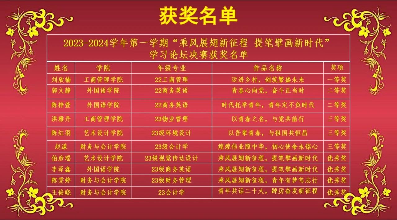 本次学习论坛比赛从2023年10月开始,在历经多场选拔后,共有十名同学脱颖而出进入决赛。决赛现场精彩纷呈,参赛选手们紧扣主题,以党的二十大精神为指引,与在场师生分享了新时代十年的历史性成就、历史性变革,强调了乡村振兴的重要性,还畅想了未来中国发展的美好蓝图。选手们用鲜活的叙事表达出对优秀共产党人的钦佩之情,展现了我校学子与党同行、勇担使命的家国情怀。最终,工商管理学院2022级工商管理专业的刘欣楠同学获得一等奖,此外还评选出二等奖2名,三等奖3名,四等奖4名。