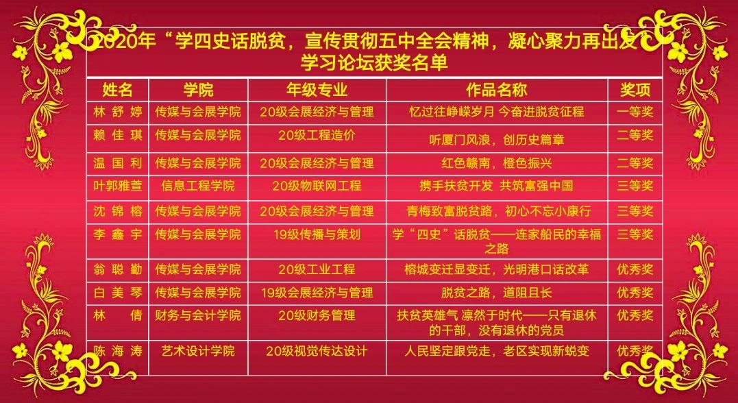 论坛以演讲比赛的形式进行,参赛选手围绕主题阐述学习党的十九届五中全会精神、“四史”和《习近平在福建》等系列采访实录的心得体会;讲述农村、农民在党的领导下的脱贫攻坚历史、先进典型以及干部群众扶贫济困的感人事迹、奋斗精神,展现干部群众同心同德共奔小康的良好精神风貌。参赛选手精神饱满,话身边人,道国家事,用一个个感人的小故事展现国家发展的大历史,鼓励、引导青年学子积极投身社会主义现代化强国的建设中,以青春担当创造美好生活。经过将近两个小时的激烈角逐,传媒与会展学院20级会展经济与管理专业林舒婷同学获得本次学习论坛决赛一等奖。活动中,永利3044集团院长林萍对比赛作了点评并针对丰富学习论坛形式等提出建议。